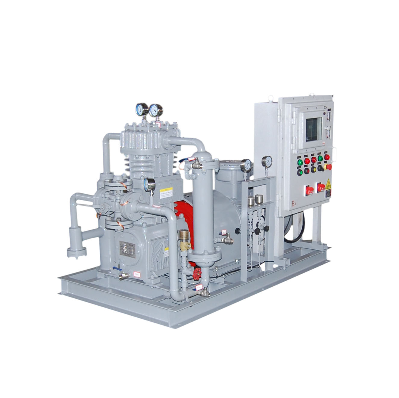 環(huán)己烷壓縮機是我公司新型產(chǎn)品,它集壓縮機、氣液分離器、安全閥冷卻器、電動機等為一體,成一完整的機組。具有功能多、體積小、重量輕、功率小、運行平穩(wěn)可靠等特點,并有良好的安全性能。它為輸送氫氣,可為用戶最大限度地創(chuàng)造經(jīng)濟效益。由于采用獨特的無油潤滑設計,氣缸內(nèi)無需用油潤滑,因而不會對介質(zhì)造成污染,使被輸送物質(zhì)保持純凈。本機設計成機組型式,許多管線上的附件都安裝在機組上,省卻了氣液分離器、穩(wěn)壓罐、安全閥、進氣過濾器等,減小了機房的面積,減少了操作維護工作量,節(jié)省了投資。